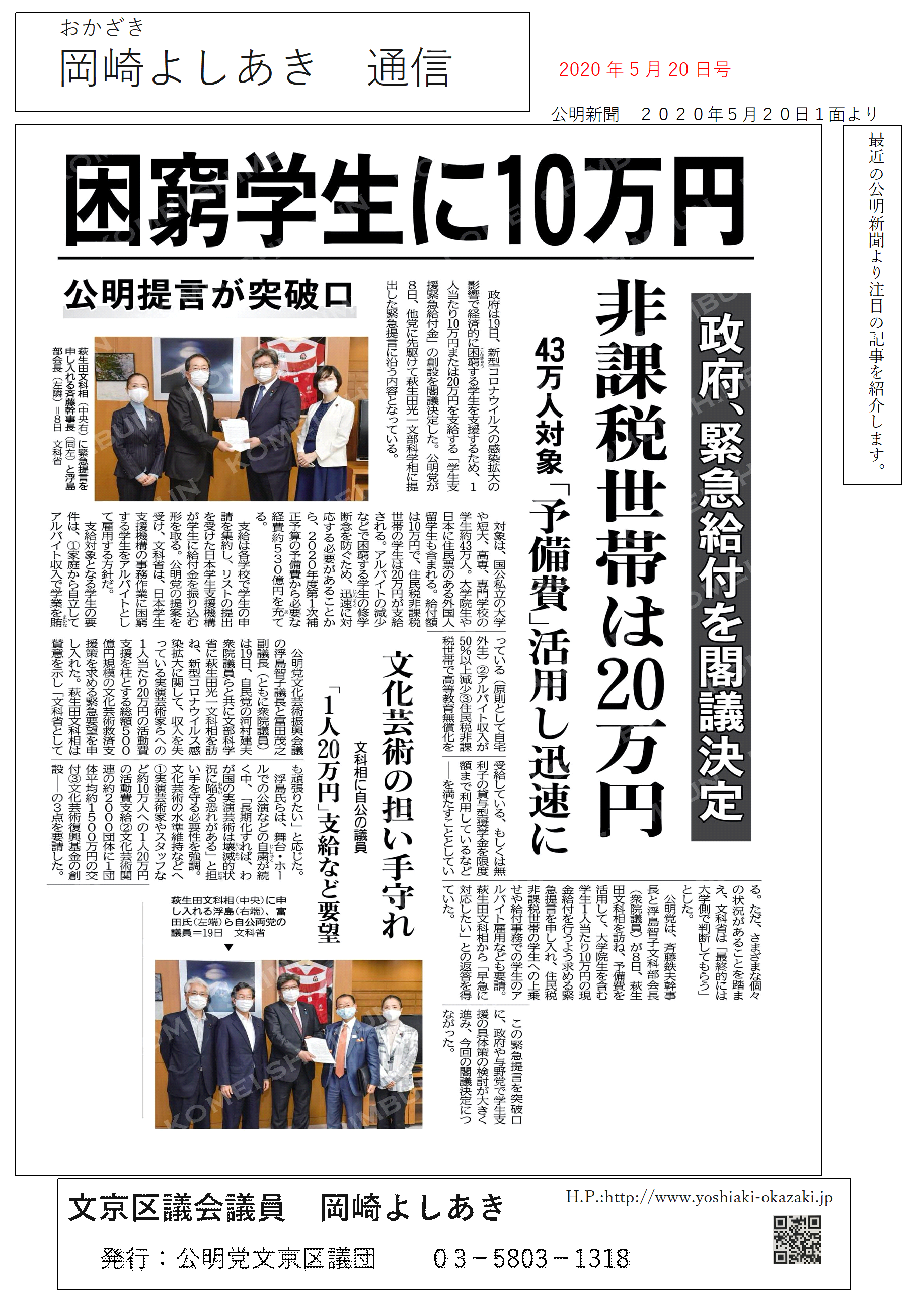 政府は19日、新型コロナの影響で経済的に困窮する学生を支援するため、1人当たり10万円または20万円を支給する「学生支援緊急給付金」の創設を閣議決定しました。公明党が8日に行った緊急提言に沿う内容となっています。
